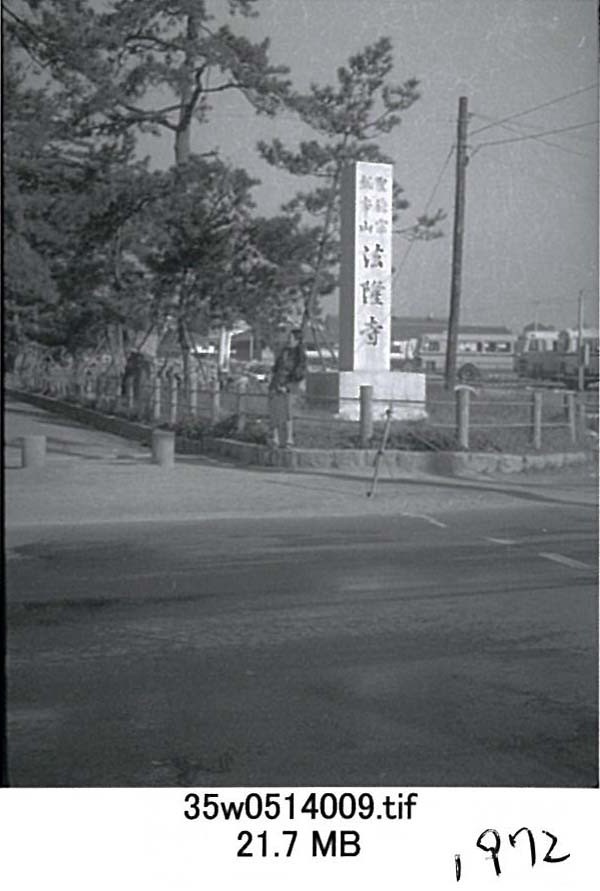 古写真:通行人(待ち合わせか)、松並木、観光バス、法隆寺参道、国道25号線 「聖徳宗総本山法隆寺」の石碑(法隆寺の「隆」の字は「隆」(異体字)である) [1]『斑鳩の生活史:聖徳太子から1400年』亀井龍彦著 斑鳩文化協議会(1998)p.82