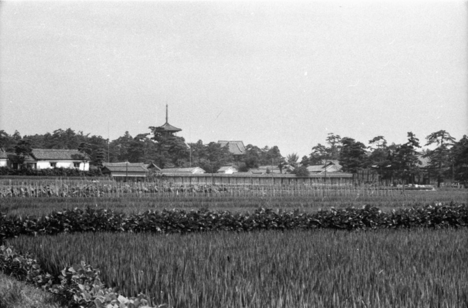 法隆寺西南の道からは、築地塀、五重塔が見える