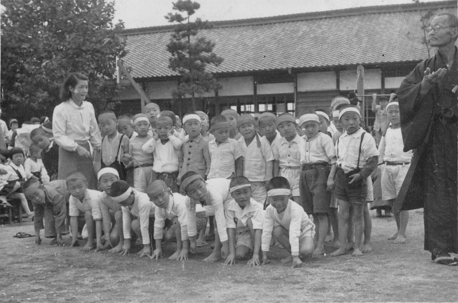 鉄棒、校舎、観戦する生徒、和服姿の男性