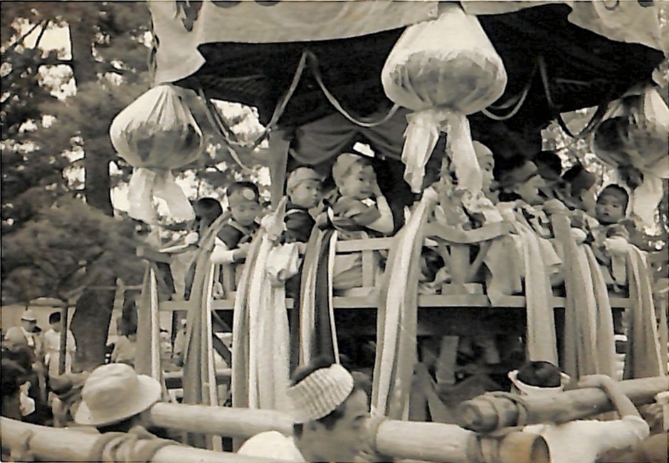 この日は雨模様だったか。提灯がビニールで覆われている。 小さい子どもは、紐を巻きつけて太鼓台に乗るのは揺れて怖いからいやだと言っていたが、成長とともに乗れるようになった。 西里・本町・東里に太鼓台があった。並松は新しく町になったとき三郷の方からもらった。