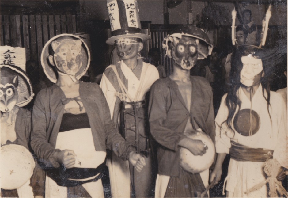 仮装(狸、丑の刻参り、地蔵堂の被り物、太鼓、ひょっとこ)