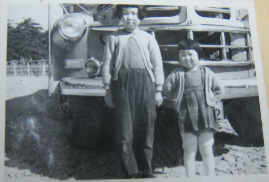 法隆寺の駐車場のボンネットバスの前で。母のお手製の服とヘアスタイルが懐かしいです。