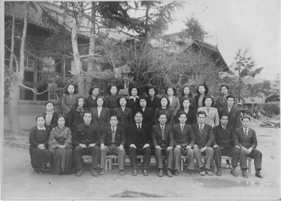 薮田校長、中田先生、魚谷先生 校舎、二宮尊徳像、手前に方形の窪み?