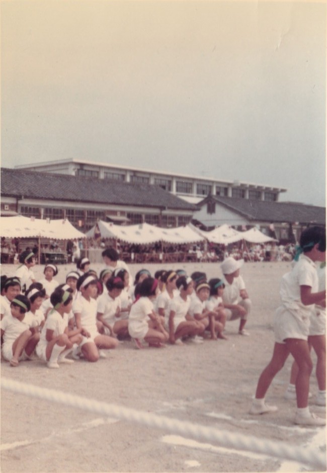 1組-赤、2組-白、3組-黄、4組-青、5組-緑、6組-ピンク(?)と色別に分かれていた。 男女ともにトレパン、トレシャツ時代。ブルマは中学生になってからだった。 応援席は自治会ごとで、ご近所の方々からも応援してもらった。 現在の北館が新館だった頃の話です。
