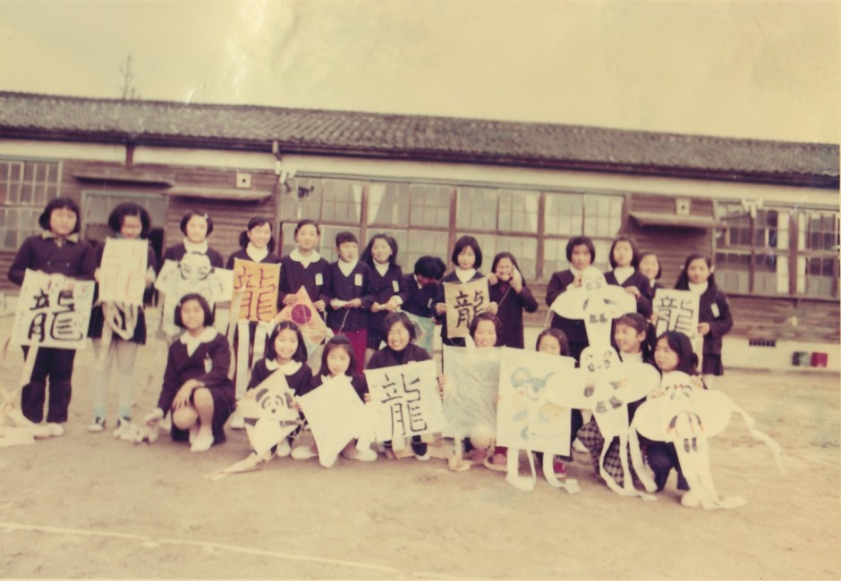 5年生の時は手作りの凧、6年生は竹馬を作った。1時間目から6時間目の授業中に作った。3学期の楽しみだった。 担任の川端先生が男女別に撮影してくれた。 後ろの校舎は現在運動場に南面している校舎が建つ前の木造の校舎。 冬はスカートの代わりにズボンやタイツなど自由にはいていた。