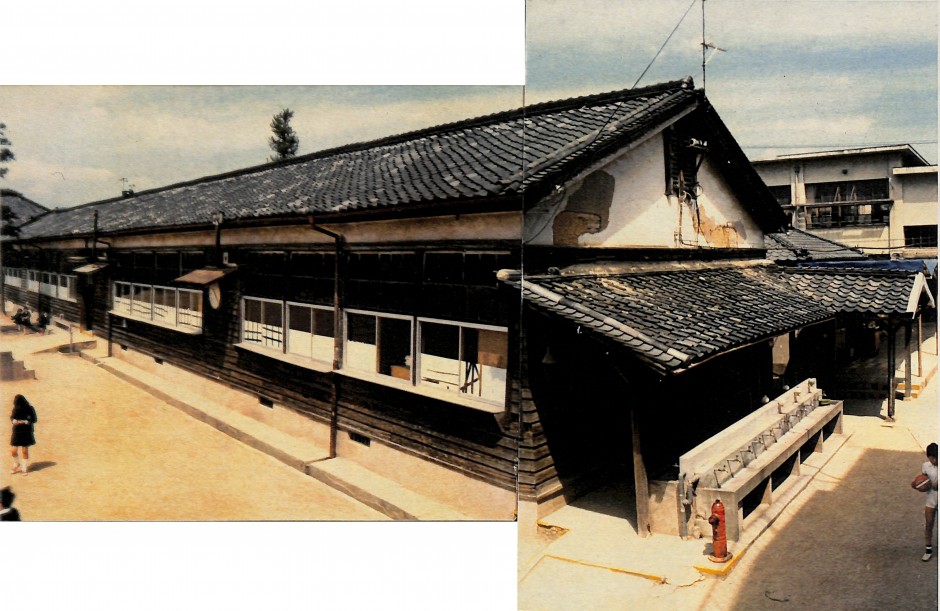 合成写真 木造校舎の北側に鉄筋コンクリート2階建ての本館が見えるので、1970年代後半だと思われる。