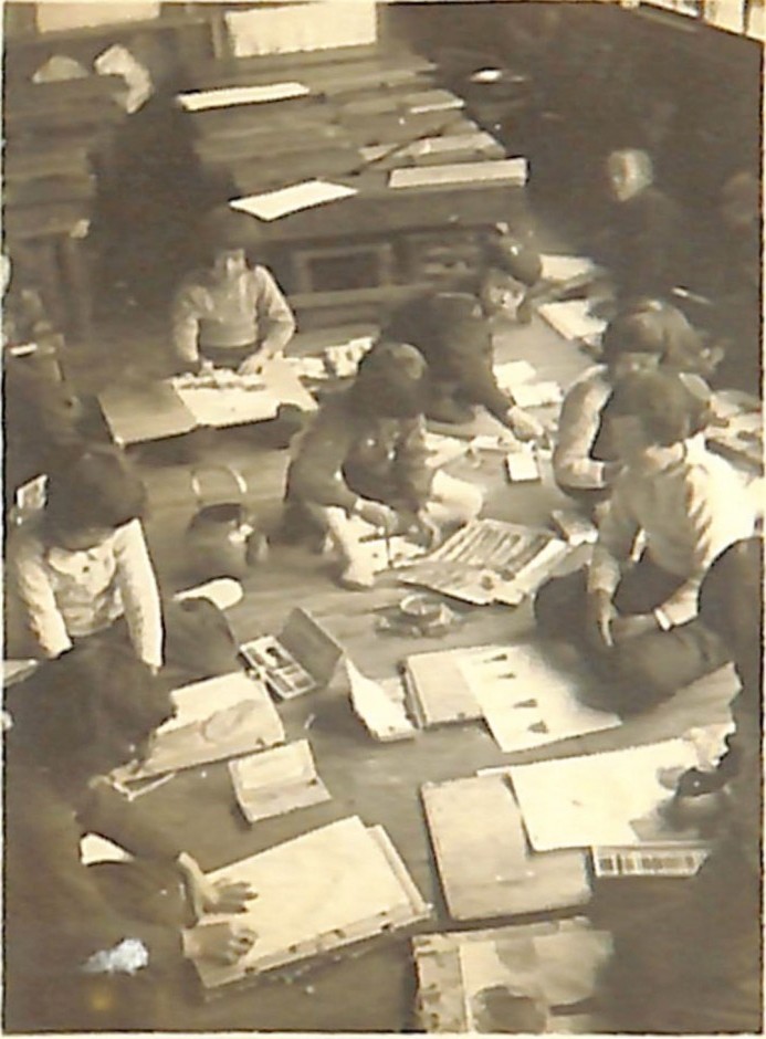 やかん、パレット、二人用木製机。 アルバム台紙に「昭和30年度 図工科研究会」と書かれている。