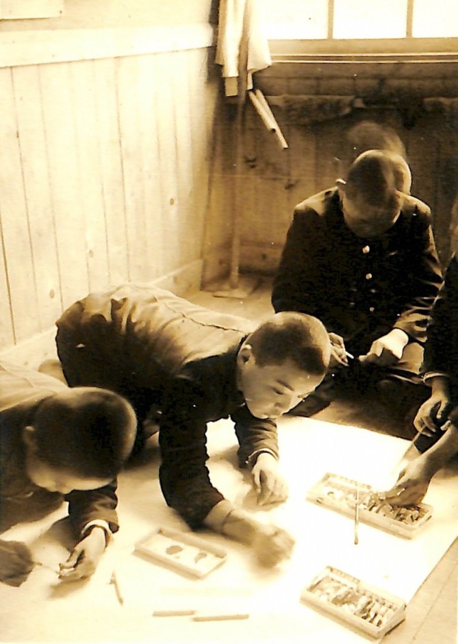 教室の隅に鍬(すき)が立てかけてある。 絵の具、パレット、筆。 アルバムの台紙に「昭和30年度 図工科研究会」と書かれている。
