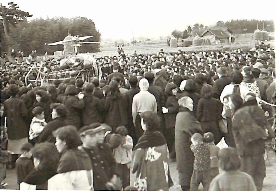 大阪毎日新聞社による中町・五番子ども会表彰式のため、ヘリコプターが飛来し運動場に下りた。