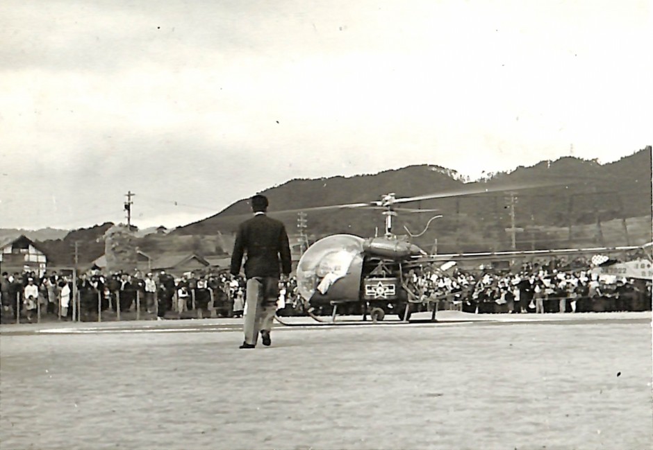 大阪毎日新聞社による中町・五番子ども会表彰式のため、ヘリコプターが飛来し、運動場に下りた。