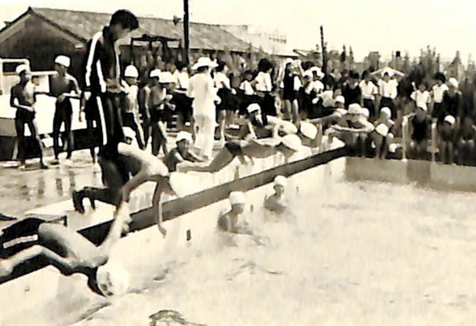 昭和40年代は雨の日でもプールの授業があった。飛び込みの練習もした。狭かった記憶がある。 白い塩素の錠剤を撒いていた。それを取って遊んだ思い出がある。
