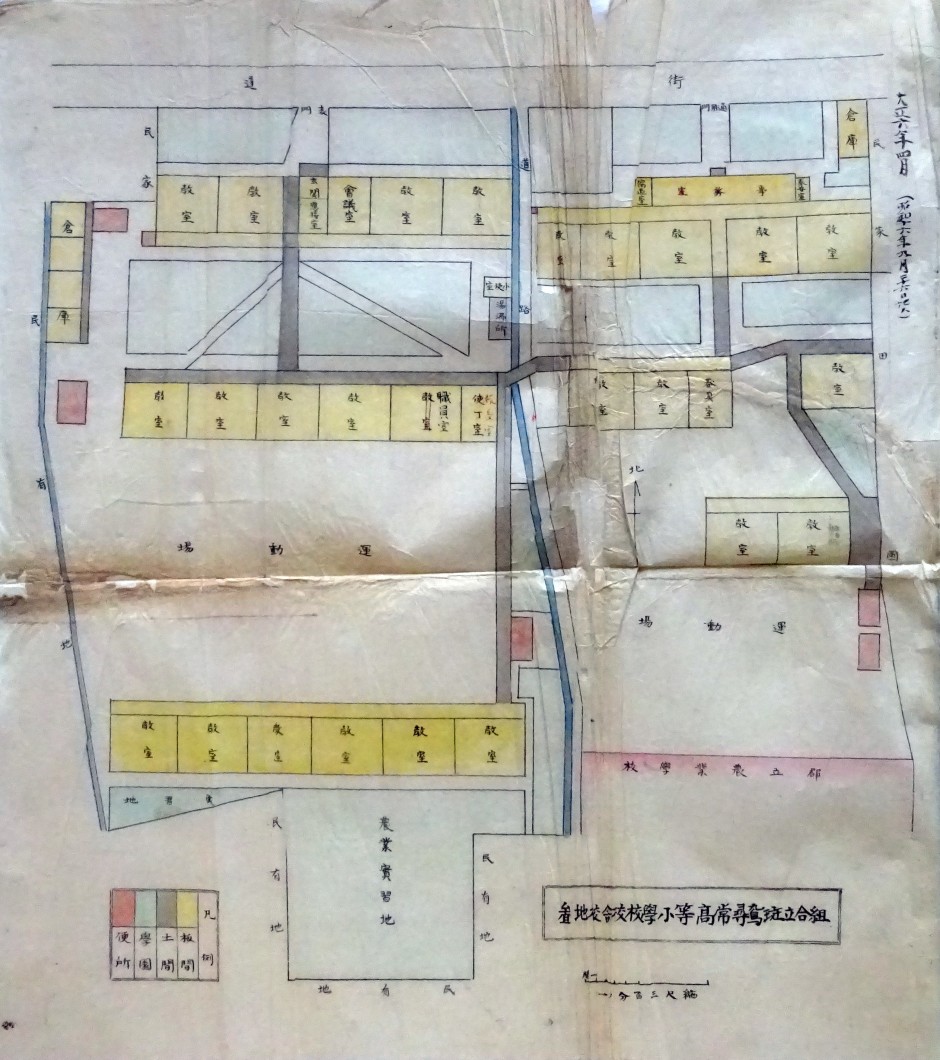 [1]『創立百周年記念誌』p.2沿革概要より この図には大正六年四月(昭和十六年九月二十六日記入)「組合立斑鳩尋常高等小学校校舎校地図」と書かれている