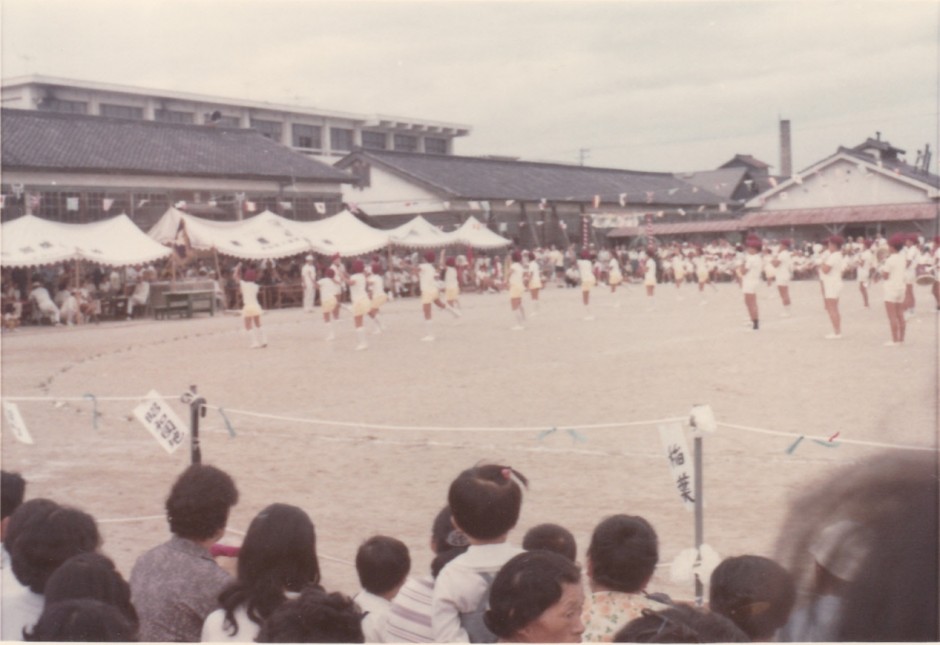 保護者の応援席に「昭和団地」「稲葉」の学区名が見える。木造校舎の奥に鉄筋の校舎が見える。右側には給食室、その奥に精麦工場の煙突が見える。