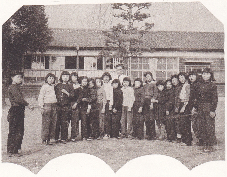 卒業アルバムのために撮影した。 当時は「なわとび」が流行していた。これより数年前の1950(昭和25~26)年頃は「ゴムとび」や「てまりつき」をして遊んだ。 「とうちゃんかあちゃん とってんかー 用事もないのにようとらん」 「テンプルちゃんが凧あげて 電信柱にひっかけて・・・」などと歌いながら遊んだ。