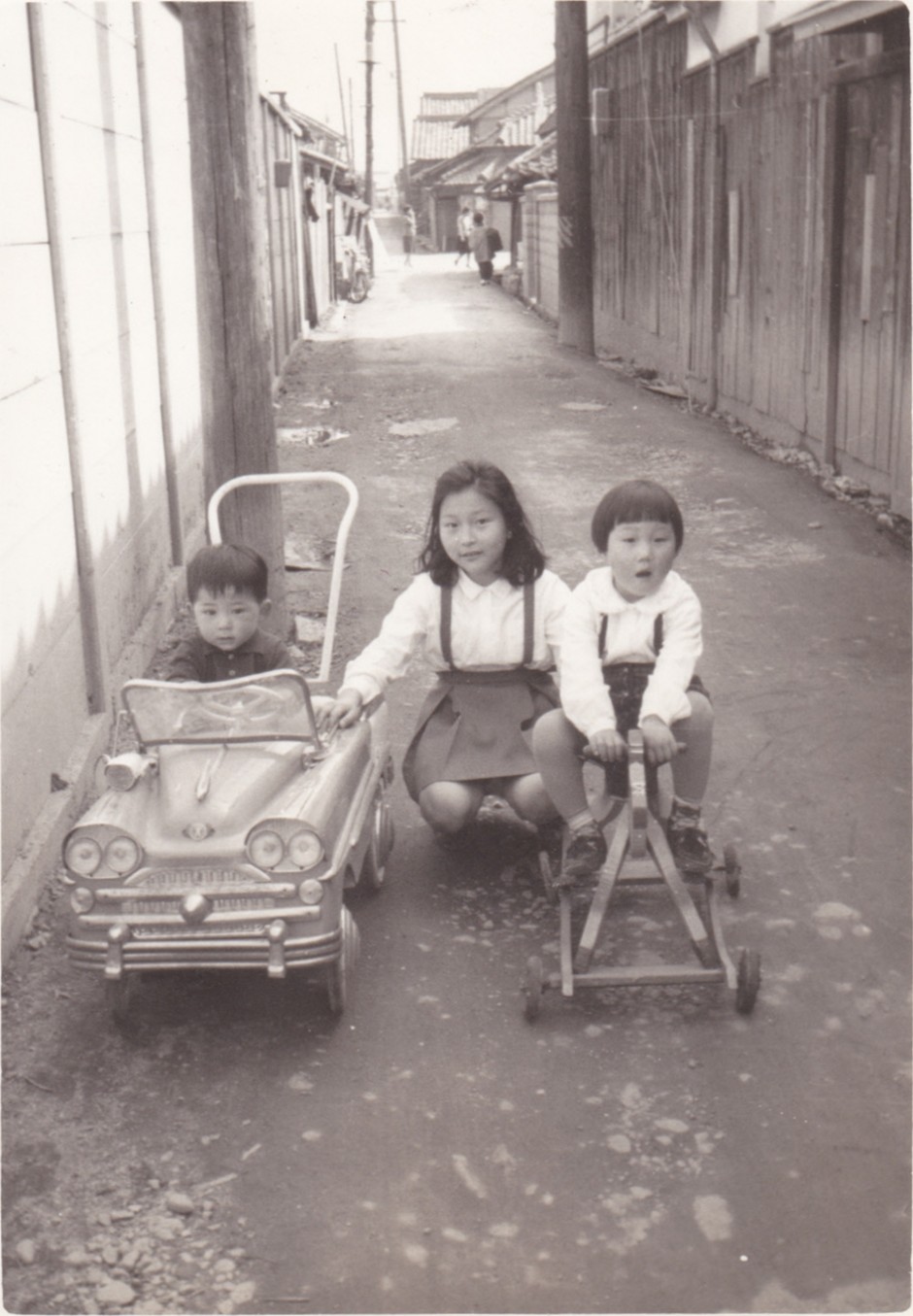 古写真:子どもの車、木馬、お姉ちゃん二人、舗装されていない道、木の電柱