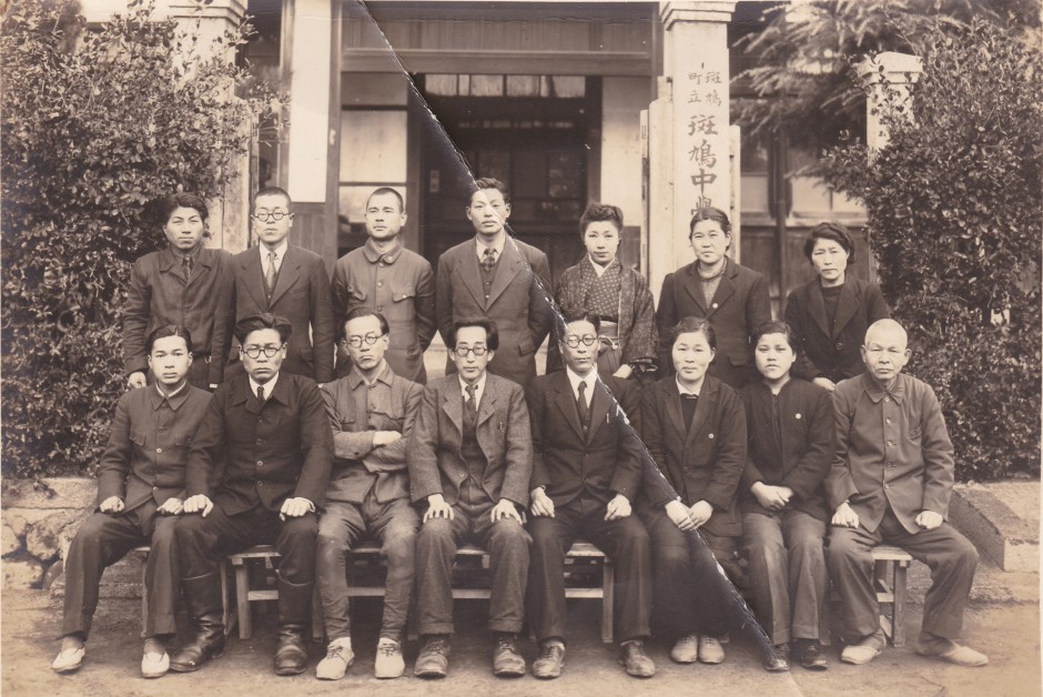 前列左から4人目が初代校長 笹谷良造氏。 斑鳩中学校校歌の作詞者でもある。