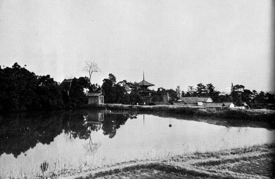法起寺への道から法隆寺の金堂と五重塔を見る