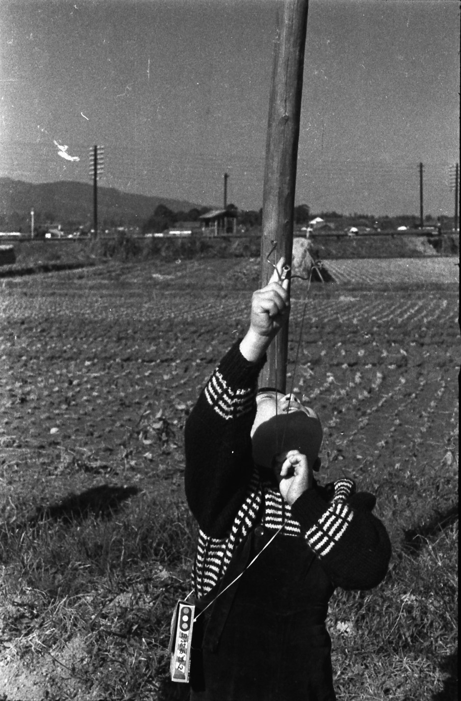 天理軽便鉄道跡近くの田でパチンコ鉄砲をうつ少年。鳥でもねらっているのだろうか。