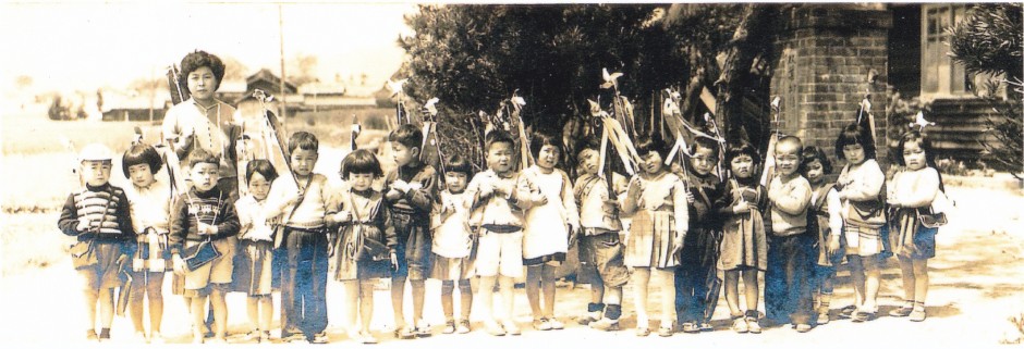 制服はなく私服で通っていた。 制作した「こいのぼり」を持って園庭で写した写真。