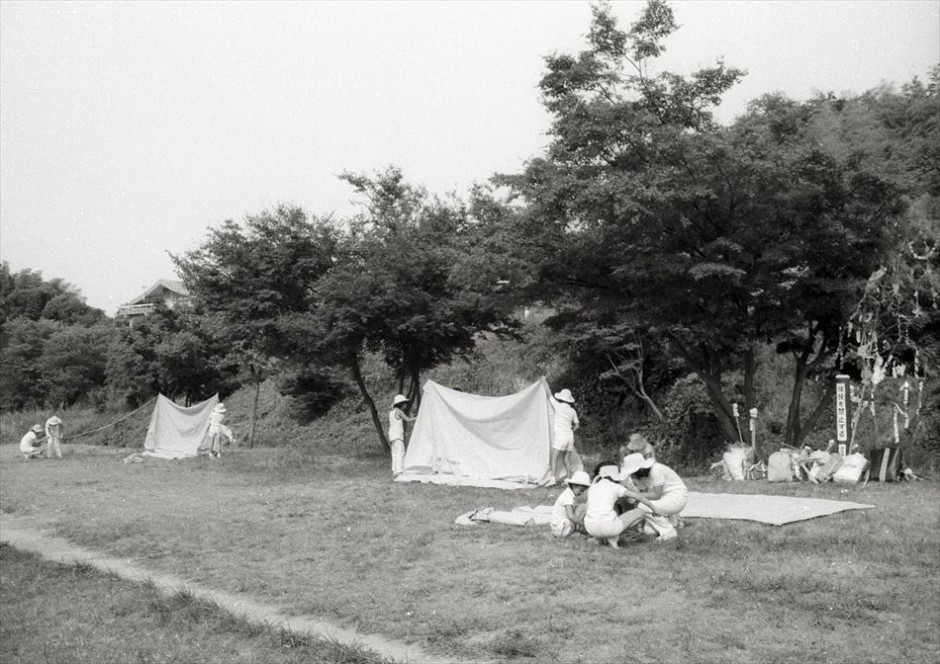 追手の子ども会が行ったキャンプ。ボランティアの方がテントの建て方を教えてくれた。怪談話などもあった。