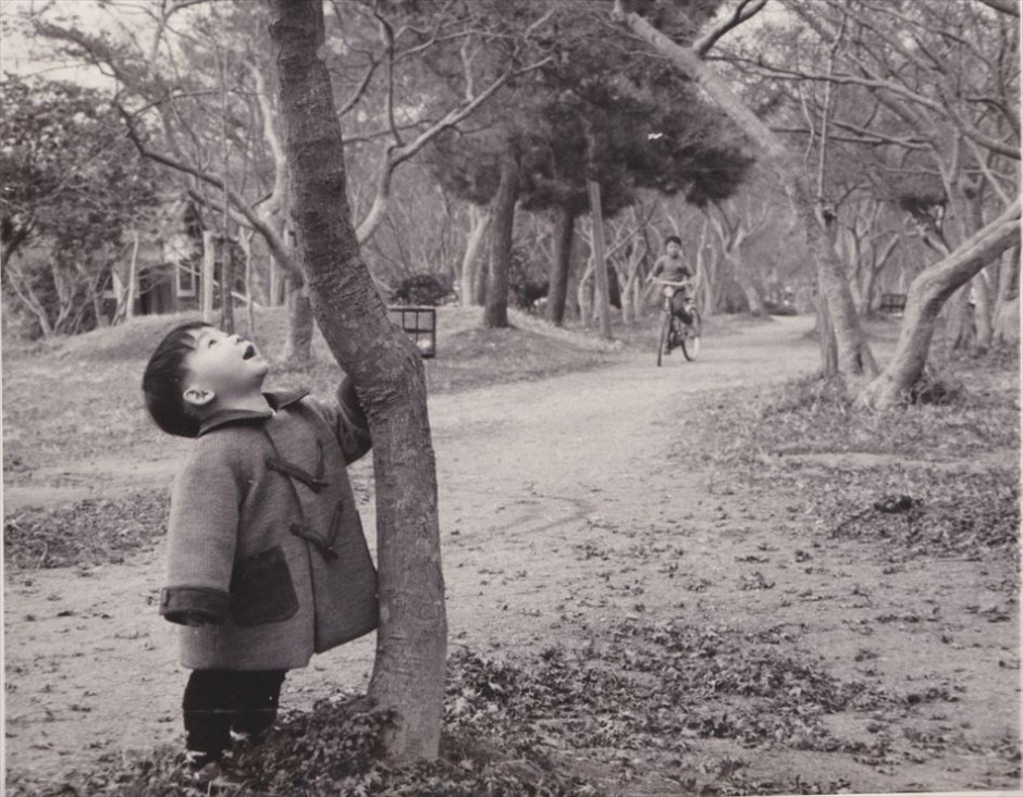 公園内の小道を自転車で走る少年