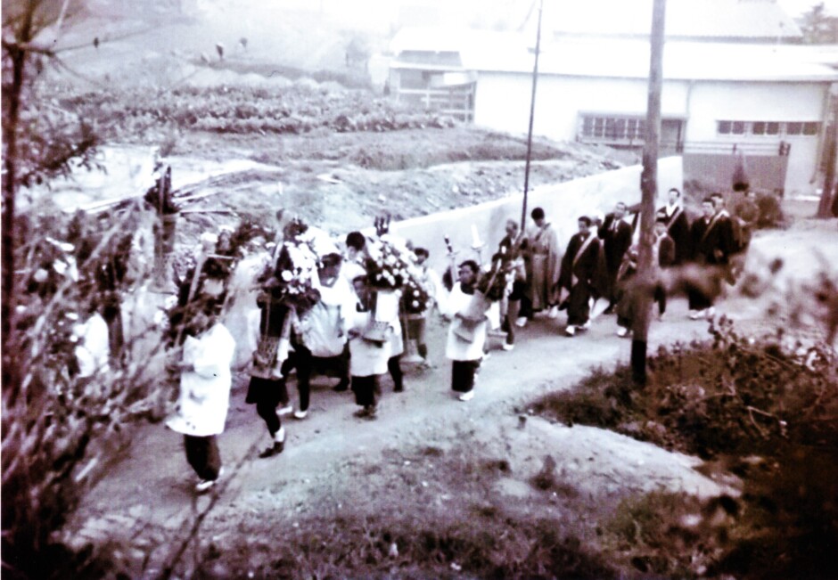 葬列は垣内(かいと)の長老が務める鉦(かね)たたきを先頭にして進んだ。